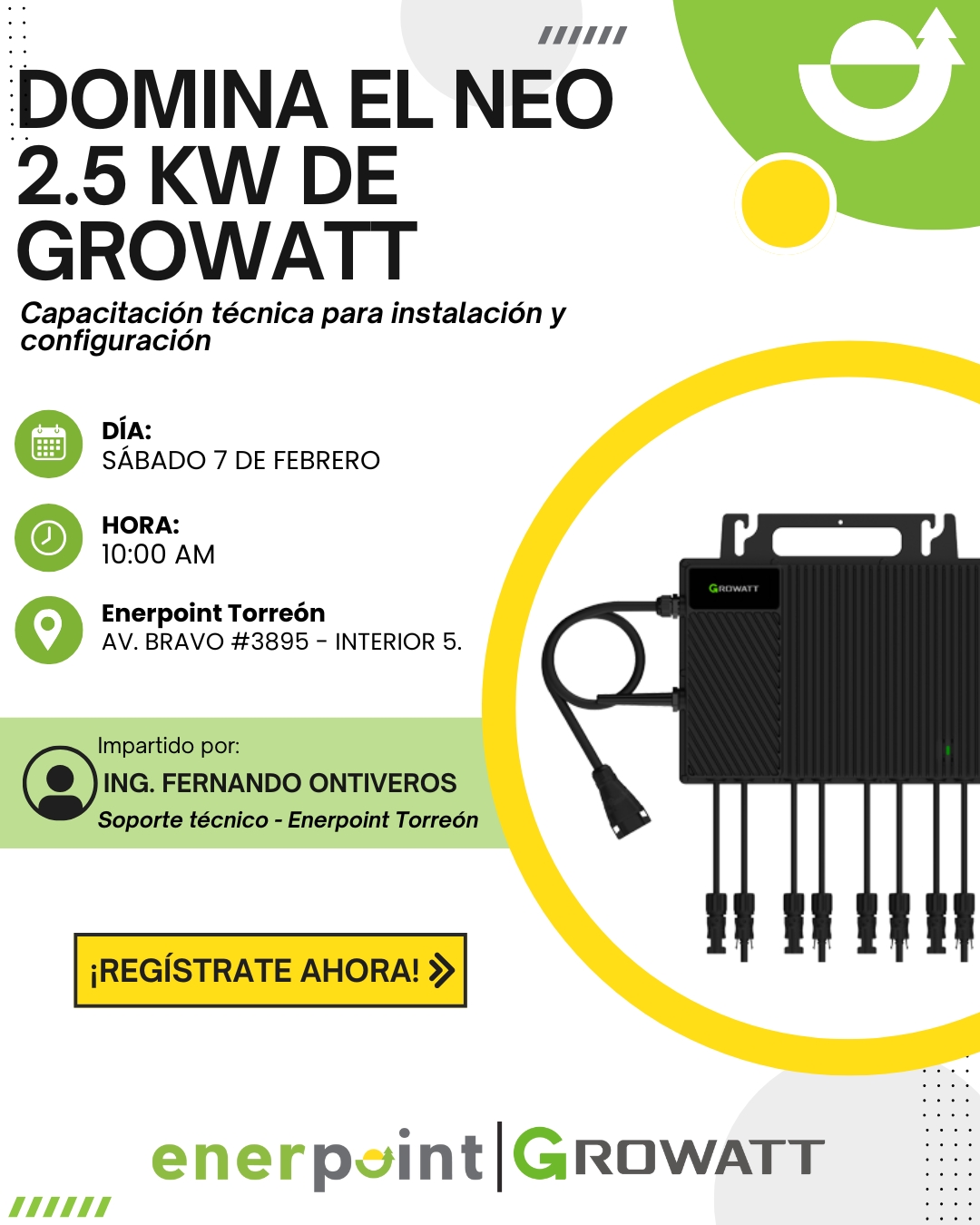 Evento presencial en Enerpoint Torreón enfocado en la correcta instalación y configuración del inversor NEO 2.5 kW de Growatt.